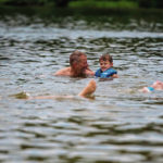 Patrick Wolff of North Huntingdon laughs with his grandson, Dennis Wolff, 4, (middle) while Grace Richards, 12, swims next to her brother, Scott, 9, (right) and their sister, Ava Richards, 12, (left) in Keystone Lake on Saturday, July 20, 2019, at Keystone State Park in Derry Township.