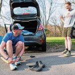 Kevin Hartnett, left, and Don Dobbs, right, both of Mt. Lebanon, chat while Hartnett laces his running shoes before hitting the trails for several miles of long distance running in South Park.