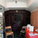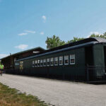 Bicyclists travel the Great Allegheny Passage trail past the West Newton Visitors Center and the renovated Pittsburgh & Lake Erie Railroad’s 1914 passenger/baggage railroad car.