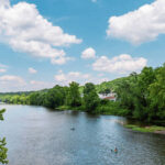 Kayakers paddle the Youghiogheny River near the West Newton bridge. Displays showing the history and heritage of the Youghiogheny River valley communities are inside the renovated Pittsburgh & Lake Erie Railroad 1914 passenger/baggage rail car at the West Newton Visitors Center along the Great Allegheny Passage.
