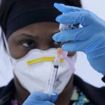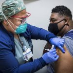 Registered nurse Marife Edquilang, left, administers a dose of Pfizer covid-19 vaccine to Anthony Monroe during a vaccination drive at Texas Southern University in Houston.
