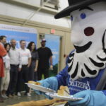 Seltzer’s mascot hands out some of the 150-foot-long (45.7-meters-long) bologna sandwich that was assembled by volunteers at the Lebanon Area Fair on Tuesday, July 25, 2023 in Lebanon, Pa.