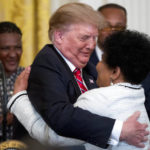 President Donald Trump hugs Alice Marie Johnson, an inmate whose life sentence was commuted thanks in part to the efforts of Kim Kardashian West, right, at the 2019 Prison Reform Summit and First Step Act Celebration in the East Room of the White House in Washington, Monday, April 1, 2019.