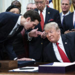 White House adviser Jared Kushner speaks with his father-in-law, President Trump during a signing ceremony for the First Step Act in December 2018.