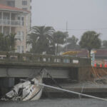 A boat damaged in Hurricane Helene rests against a bridge ahead of the arrival of Hurricane Milton, in South Pasadena, Fla., Wednesday, Oct. 9, 2024.