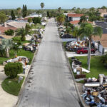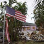 A tattered American flag flaps Tuesday outside a home as furniture and household items damaged by Hurricane Helene flooding sit piled along the street awaiting pickup, ahead of the arrival of Hurricane Milton in Holmes Beach on Anna Maria Island, Fla.