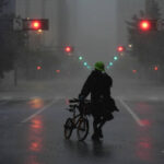 A person walks under light rain ahead of the arrival of Hurricane Milton, Wednesday, Oct. 9, 2024, in Tampa, Fla.