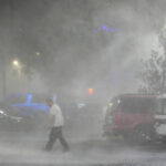 Max Watts, of Buford, Ga., walks in the parking lot to check on a trailer parked outside the hotel where he is riding out Hurricane Milton with coworkers in Tampa, Fla. Watts, who works for a towing company, was deployed with colleagues to Florida to aid in the aftermath of the storm.