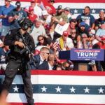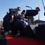 Republican presidential candidate former President Donald Trump is covered by U.S. Secret Service agents at a campaign rally, Saturday, July 13, 2024, in Butler, Pa. (AP Photo/Evan Vucci)