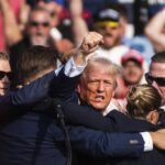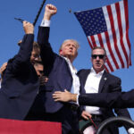 Former President Donald Trump makes a fist gesture towards the crowd after being shot in the ear during an attempted assassination at a rally Saturday in Butler.