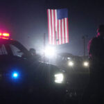 An officer stands at his car early Sunday, closing access to the site of the rally where former President Donald Trump was the target of an assassination attempt on Saturday in Butler, Pa.. Behind the officer, a large flag from the rally still flies.