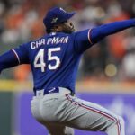 Josh Sborz walked Jose Altuve starting the eighth and was replaced by Aroldis Chapman. The Rangers turned a double play when Carter made a great grab on the track on a ball hit by Alex Bregman and Altuve was called out for not retouching second base when he retreated to first after Carter’s catch.