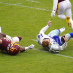 Dallas Cowboys quarterback Andy Dalton was knocked out of the game Sunday when he was hit late by Washington linebacker Jon Bostic.