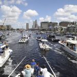 Dozens of residents on boats and other watercraft enjoyed a close view of vessels carrying players and coaches. A post-parade rally in a downtown park was delayed more than an hour when a heavy thunderstorm accompanied by gusting winds sent fans scattering for cover.