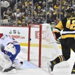 After Penguins forward Jeff Carter won an offensive zone draw in the right circle, Letang settled the puck at the right point and motioned to the center point, where he slid a forehand pass to the left circle. From there, Rodrigues teed up a one-timer that blew past Allen’s glove on the far side for his ninth goal. Letang and Carter were awarded assists.