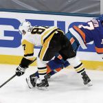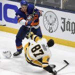 The Islanders’ Ryan Pulock tries to hit the Penguins’ Sidney Crosby in the second period in Game 3 of their first-round playoff series Thursday, May 20, 2021, at Nassau Veterans Memorial Coliseum in Uniondale, N.Y.