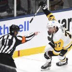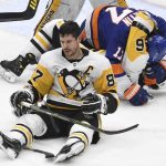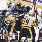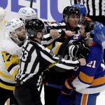 After a goalmouth scramble was whistled dead, all five skaters on the ice clustered in a scrum that never seemed to end. The officials sent all 10 skaters — forwards Sidney Crosby, Jake Guentzel, Bryan Rust, Letang and defenseman Brian Dumoulin of the Penguins as well as forwards Jean-Gabriel Pageau, Kyle Palmieri, Oliver Wahlstrom, Mayfield and defensemen Nick Leddy of the Islanders — to the penalty box for roughing minors.