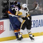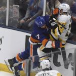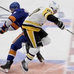 The Islanders’ Ryan Pulock hits the Penguins’ Jason Zucker in the second period in Game 3 of their first-round playoff series Thursday, May 20, 2021, at Nassau Veterans Memorial Coliseum in Uniondale, N.Y.