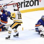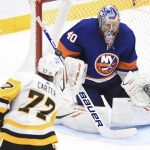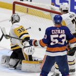 A shot by the Penguins’ Jeff Carter beats Islanders goaltender Semyon Varlamov in the second period in Game 3 of their first-round playoff series Thursday, May 20, 2021, at Nassau Veterans Memorial Coliseum in Uniondale, N.Y.