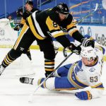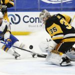 The Penguins took a 1-0 lead 6 minutes, 27 seconds into regulation. After a botched passing sequence between Sabres forward Casey Mittelstadt and defenseman Jacob Bryson at their own blue line, Penguins forward Kasperi Kapanen swiped the puck and created his own breakaway. Instead of shooting, he left a drop pass for the skater chasing him, linemate Evgeni Malkin, who lifted a forehand shot over goaltender Jonas Johansson’s left leg for his seventh goal.