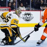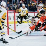 Rust scored again at 14:55 of the first period on a four-on-four sequence. After Rodrigues had a wrister from above Philadelphia’s right circle blocked by Flyers defenseman Egor Zamula, the rebound skidded to the slot, where Rust barged in, settled the puck with his left skate and pushed a forehand shot through Hart’s five hole. Rodrigues and Letang collected assists.
