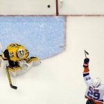 The Islanders took the game’s first lead 7:58 into regulation when forward Kyle Palmieri lifted a wrister from the right circle of the offensive zone over Jarry’s left shoulder on the near side.