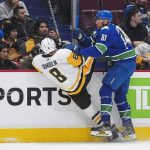 Following the expiration of a power-play opportunity, Canucks forward Connor Garland controlled the puck in the Penguins’ left corner then chopped a slap-pass through the slot to Canucks forward Ilya Mikheyev. Battling Pearson above the crease, Penguins defenseman Brian Dumoulin abandoned that endeavor and slid to block a passing lane with a tactic that resembled something of a break-dancing maneuver. Mikheyev snapped a forehand pass past Dumoulin’s right skate to the unguarded Pearson, who tapped in an easy forehand shot past Jarry’s right skate. Mikheyev and Garland had assists.