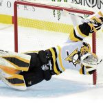 The Penguins took their first lead late in the first at the 19:13 mark when defenseman Brian Dumoulin’s wrist shot from the right point of the offensive zone glanced off the right arm of Devils forward Janne Kuokkanen, bounced off the ice and deflected to the far side. It was Dumoulin’s second goal this season.