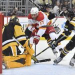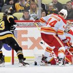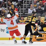 The Flames’ Rasmus Andersson celebrates his goal against the Penguins in the first period Thursday, Oct. 28, 2021, at PPG Paints Arena.