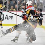 The Penguins’ Jason Zucker gets hit in the face by the Flames’ Erik Gudbranson in the first period Thursday, Oct. 28, 2021, at PPG Paints Arena. Gudbranson got a double minor on the play.