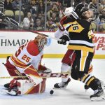Flames goaltender Jacob Markstrom makes a save on the Penguins’ Brock McGinn in the second period on Thursday, Oct. 28, 2021 at PPG Paints Arena.