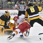 Penguins’ Brian Dumoulin knocks down the Flames’ Trevor Lewis in the second period on Thursday, Oct. 28, 2021, at PPG Paints Arena.