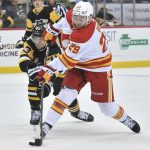 Penguins’ Danton Heinz defends on the Flames’ Dillon Dube in the second period on Thursday, Oct. 28, 2021 at PPG Paints Arena.