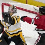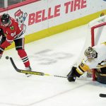 The puck fluttered past Jarry’s blocker on the far side then clunked off the upper post and rattled into the cage for Jones’ first goal. Assists went to forwards Patrick Kane and DeBrincat.