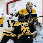 After a weak clearing attempt from his own right circle by Penguins defenseman John Marino was intercepted at the right point, Bruins forward Patrice Bergeron swept the puck back into the same circle to Bruins forward Taylor Hall. Going from his backhand to his forehand, Hall fed a pass to the left dot for Bruins forward David Pastrnak, who cranked a one-timer that glanced off Jarry’s right leg then hit twine. It was Pastrnak’s 23rd goal off the season. Hall and Bergeron had assists.