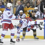 They took first lead of the game at 3:14 of the second period thanks to Matheson’s first career postseason goal. Beating Rangers forward Mika Zibanejad on a draw in New York’s right circle, Crosby swatted a backhand pass to the center point for Matheson. Surveying for a shooting lane, Matheson snapped off a wrister that glanced off the left leg of Rangers forward Frank Vatrano and then underwent a course correction, fluttering past Shesterkin’s blocker. The only assist was claimed by Crosby.