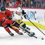 A power-play goal by Penguins forward Rickard Rakell at 12:20 of the second tied the game, 1-1. After Penguins forward Sidney Crosby beat former teammate Jordan Staal on a faceoff in the Hurricanes’ left circle, Penguins defenseman Kris Letang settled the puck at the left point and then dished it to Malkin above the right circle. Surveying the zone for a moment, Malkin snapped a pass to the slot where Rakell coasted to an open area and deflected the puck past rookie goaltender Pyotr Kochetkov’s blocker for his 13th goal. Malkin and Letang tallied assists.