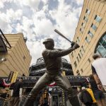 A few hours before the first pitch, William McGee of Bethel Park took a seat under the statue of his favorite Pirate, Roberto Clemente. McGee has Clemente’s 1971 baseball card.