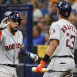 Houston Astros’ Robinson Chirinos, left, celebrates his home run against the Tampa Bay Rays with Michael Brantley (23) during the eighth inning of Game 4 of a baseball American League Division Series, Tuesday, Oct. 8, 2019, in St. Petersburg, Fla.