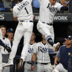 Tampa Bay Rays’ Willy Adames (1) celebrates his solo home run against the Houston Astros with right fielder Avisail Garcia, right, in the fourth inning of Game 4 of a baseball American League Division Series, Tuesday, Oct. 8, 2019, in St. Petersburg, Fla.