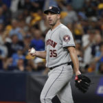 Houston Astros starting pitcher Justin Verlander walks back to the mound after giving up a walk in the second inning of Game 4 of the baseball team’s American League Division Series against the Tampa Bay Rays, Tuesday, Oct. 8, 2019, in St. Petersburg, Fla.