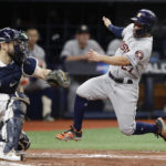 Houston Astros’ Jose Altuve, right, heads for home, but is tagged out by Tampa Bay Rays catcher Travis d’Arnaud during the fourth inning of Game 4 of a baseball American League Division Series, Tuesday, Oct. 8, 2019, in St. Petersburg, Fla.