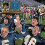 Franklin Regional’s Matt Giugliano (5), Geno Lodovico (46), John Malecki (74) and Brad Phillips celebrate with the 2005 AAA state championship trophy after defeating Pottsville, 23-13, in Hershey.