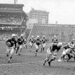 New Kensington’s Vince Pisano (28) runs a sweep against Har-Brack on Nov. 27, 1947, at Forbes Field in the WPIAL Class AAA title game. New Kensington won, 27-0. The William Pitt Student Union building is seen in the background.