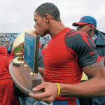Jeannette senior Terrelle Pryor kisses the championship trophy after the Jayhawks defeated Dunmore, 49-21, in the 2007 PIAA Class AA state championship game in Hershey.