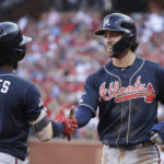 The Braves’ Dansby Swanson (right) celebrates with Ozzie Albies after scoring during the fifth inning in Game 4 of a National League Division Series against the St. Louis Cardinals on Monday, Oct. 7, 2019, in St. Louis.