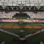 Organizers brought touches of home, such as the grounds crew dancing to the Village People’s “YMCA.” The sound system played “Sweet Caroline” in the eighth and “New York, New York” after the final out.
