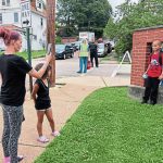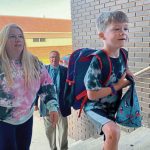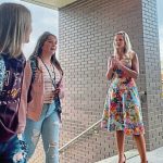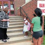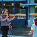 Leechburg Area School District superintendent Tiffany Nix greets high school students and sisters Sydnee and London Platt of Leechburg. Nix said the district has a 99 percent in-person back-to-campus return rate, with eight students selecting virtual learning. LASD enrolls about about 750 students.
