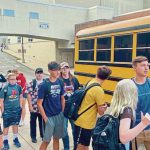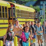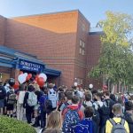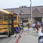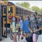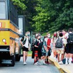 Franklin Regional students exit busses at the new Franklin Regional Intermediate School for grades three through five. 738 students attend the new in Murrysville. Monday Aug 23, 2021.