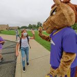 Plum student Katie Adams 10, high fives the Plum Mascot Mustang as she arrives for her first day of school Thursday. Aug 19, 2021. Adams will attend the fifth grade at OՂlock Elementary.